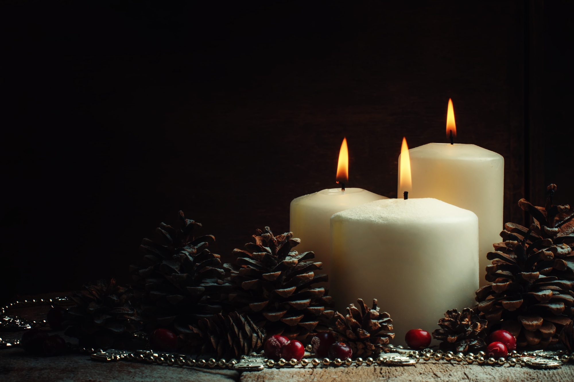 Christmas or New Year's composition with burning white candles, pine cones and red berries, dark wood background, selective focus