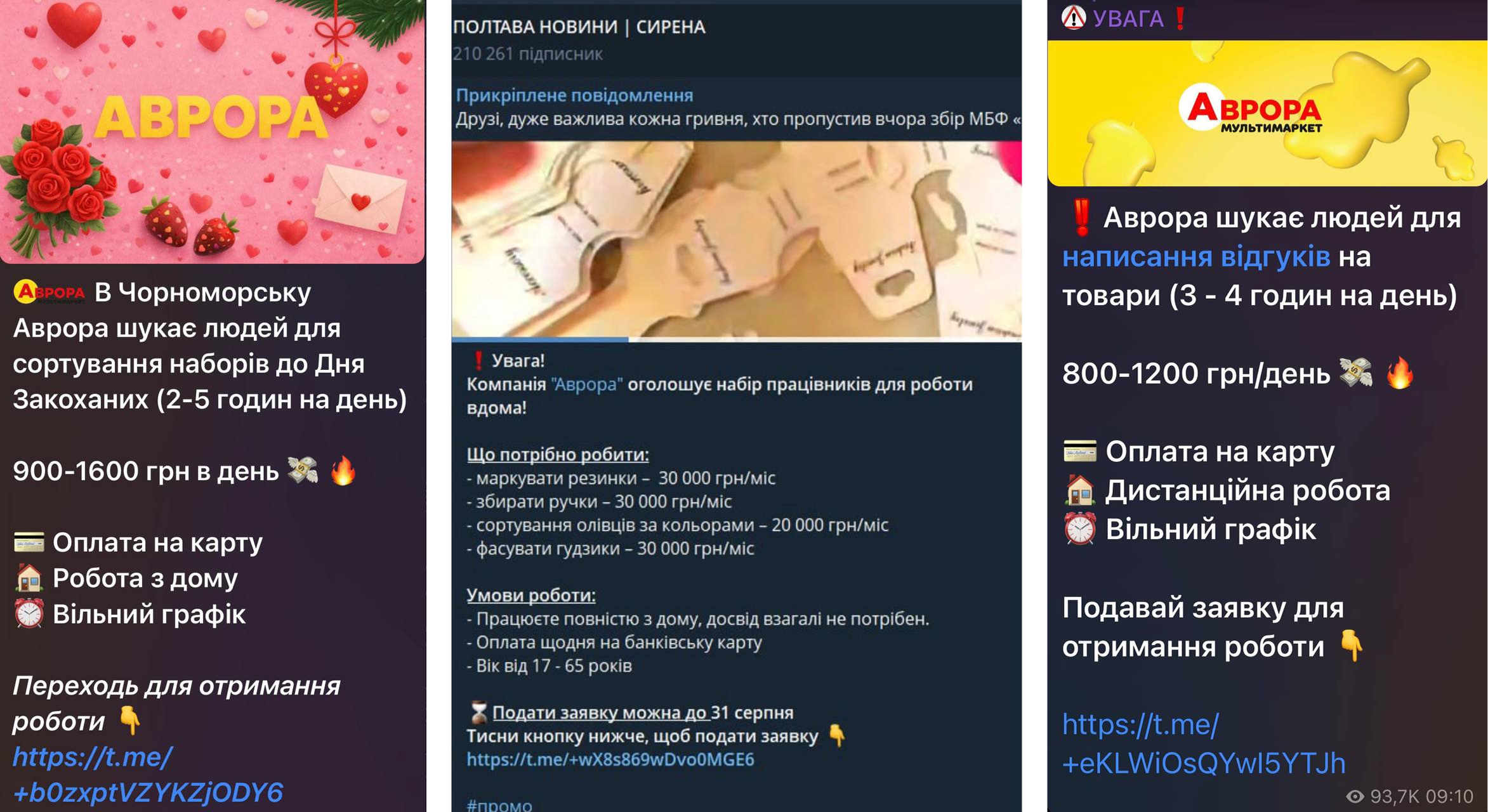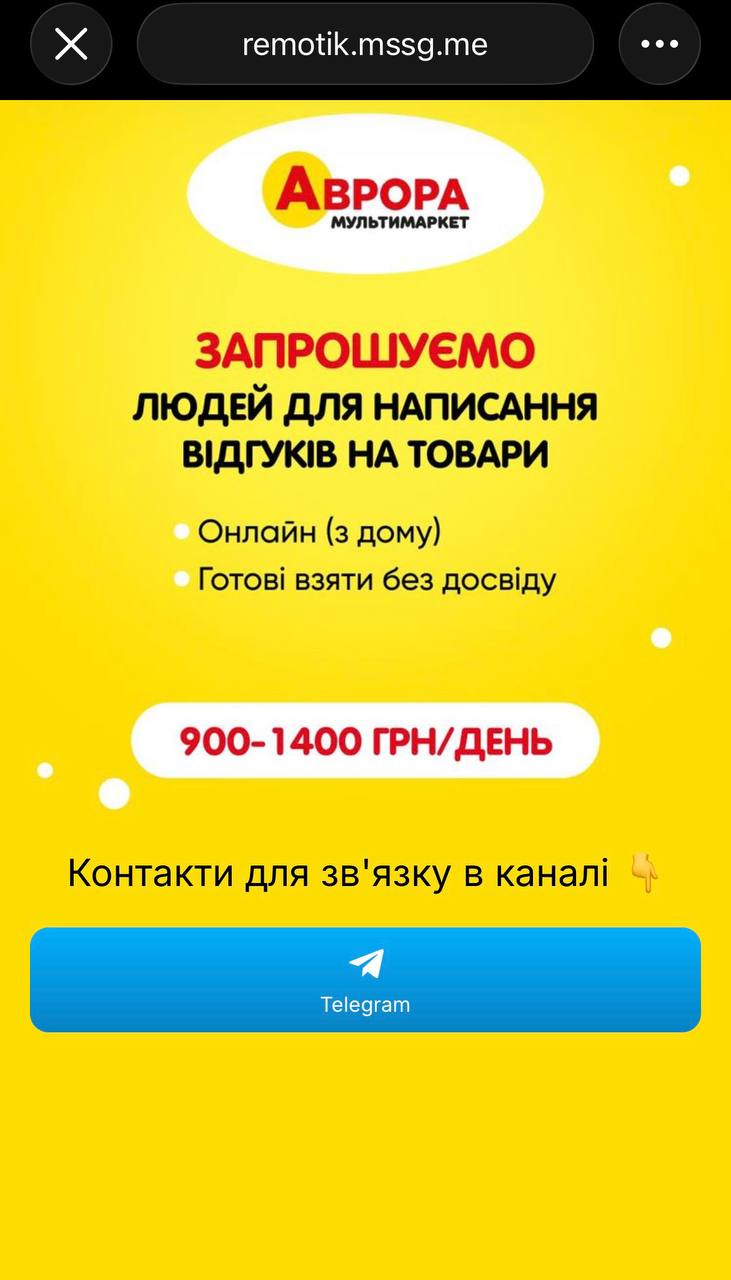 «Дуже радимо перевіряти вакансії. Мережа “Аврора” не пропонує роботу на дому. Усі наші вакансії публікуються на офіційних сайтах з пошуку роботи, на сайті https://robota.avrora.ua/vakansiyi та офіційних сторінках у соціальних мережах. Ще можна зателефонувати у контакт-центр чи службу підтримки — там вам підтвердять правдивість чи фейковість даної пропозиції», – розповідає Юлія Стороженко, керівниця HC-маркетингу мережі «Аврора».